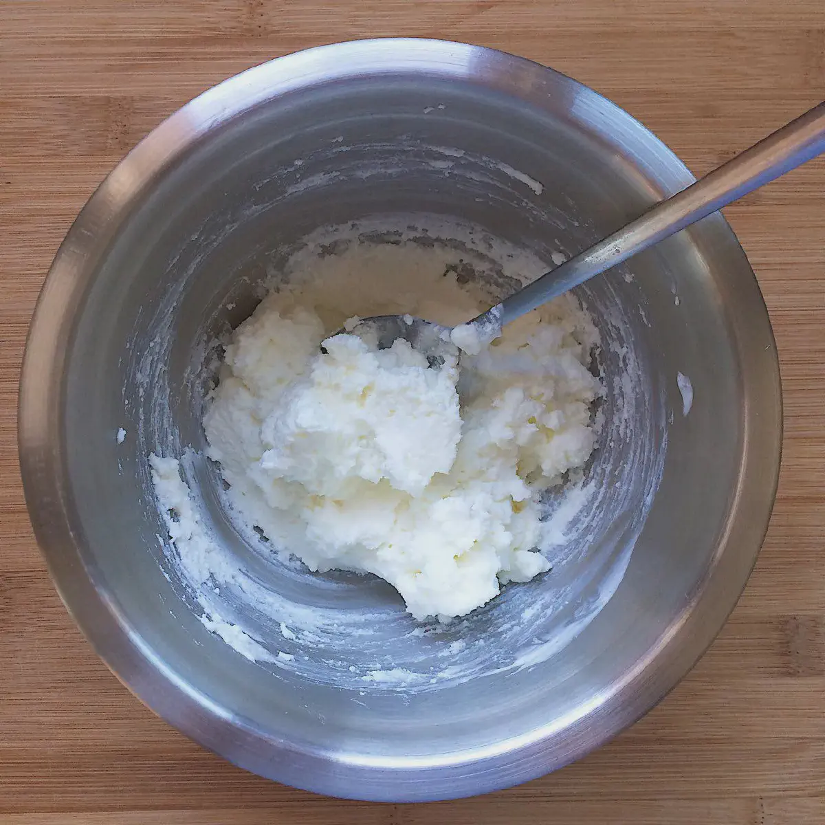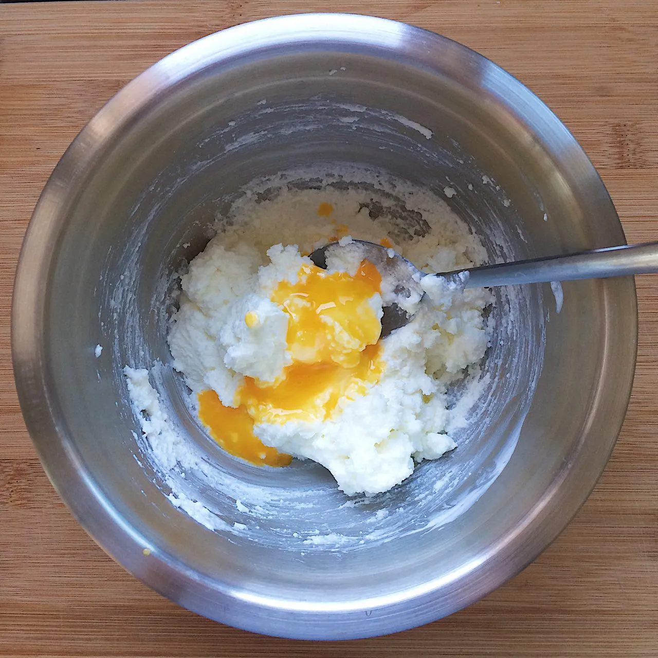 Добавляем желток (1/2 шт, 10 гр), и снова перемешиваем до однородной массы. Смотри — она должна быть густой, и не растекаться в миске. Если творог сухой, можно добавить чуть больше сметаны, или даже сливок — зависит от консистенции — она должна напоминать мягкий творожок из баночек — форму держит, с ложки не бежит, но не сухая.