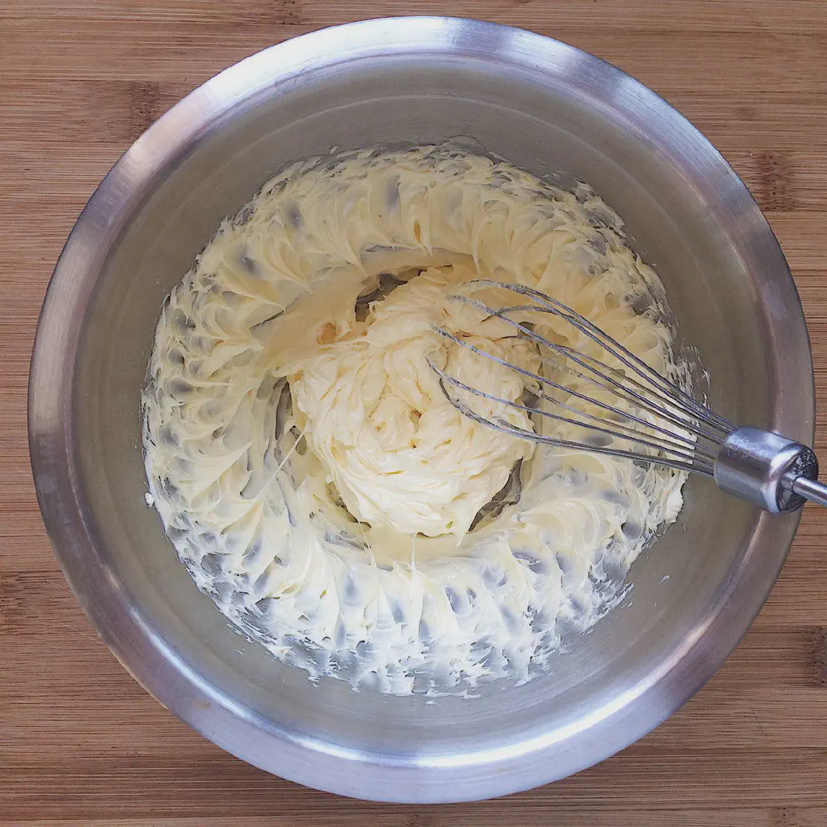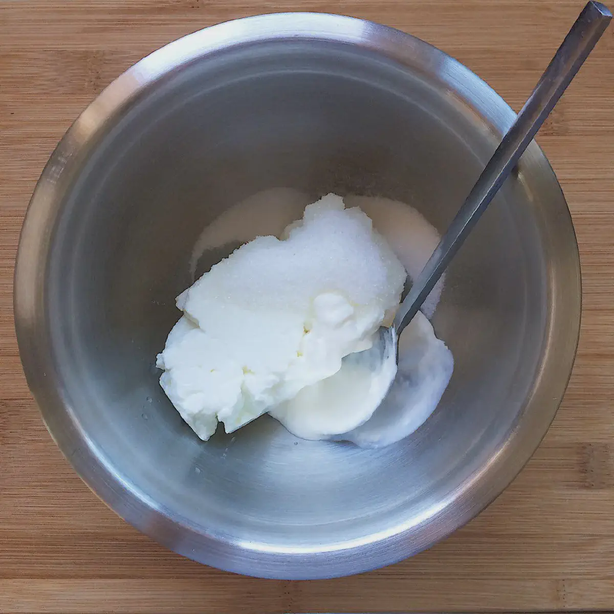 Как только сливочное масло (100 гр) размякло, соединяем его с сахарной пудрой (50 гр.), и взбиваем до однородности. Не надо доводить до пышности — просто соединить.