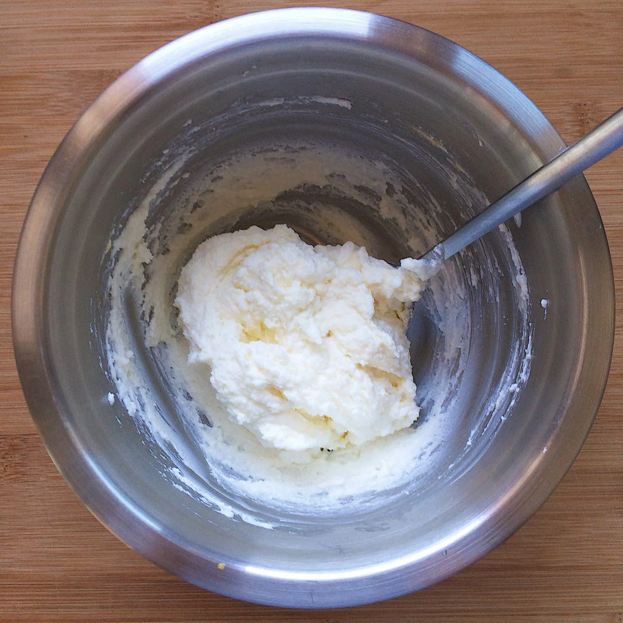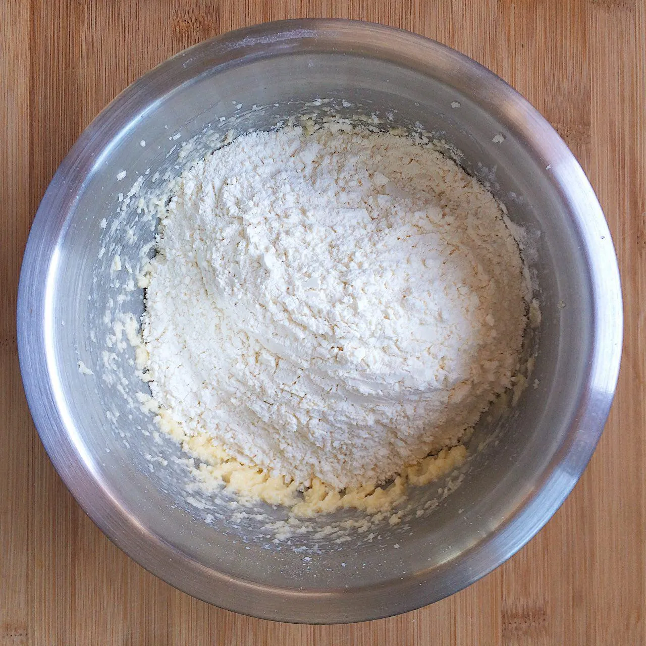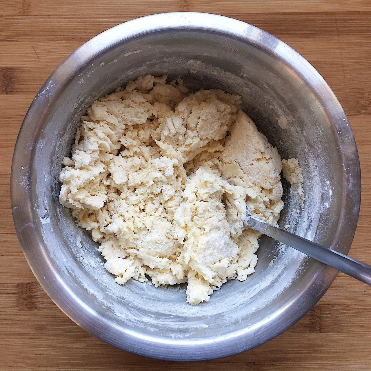 Перемешиваем масляную и мучную смеси ложкой. Не делаем это руками, чтобы масло не начало активно таять — от этого тесто может получиться грубым. Из-за этого же тесто не стоит делать в жару — можно исхитриться, и поддерживать нужную температуру теста, но это дикие танцы с бубном — поймать момент, когда масло подтаяло, но еще не потекло, и поддерживать его в таком состоянии…