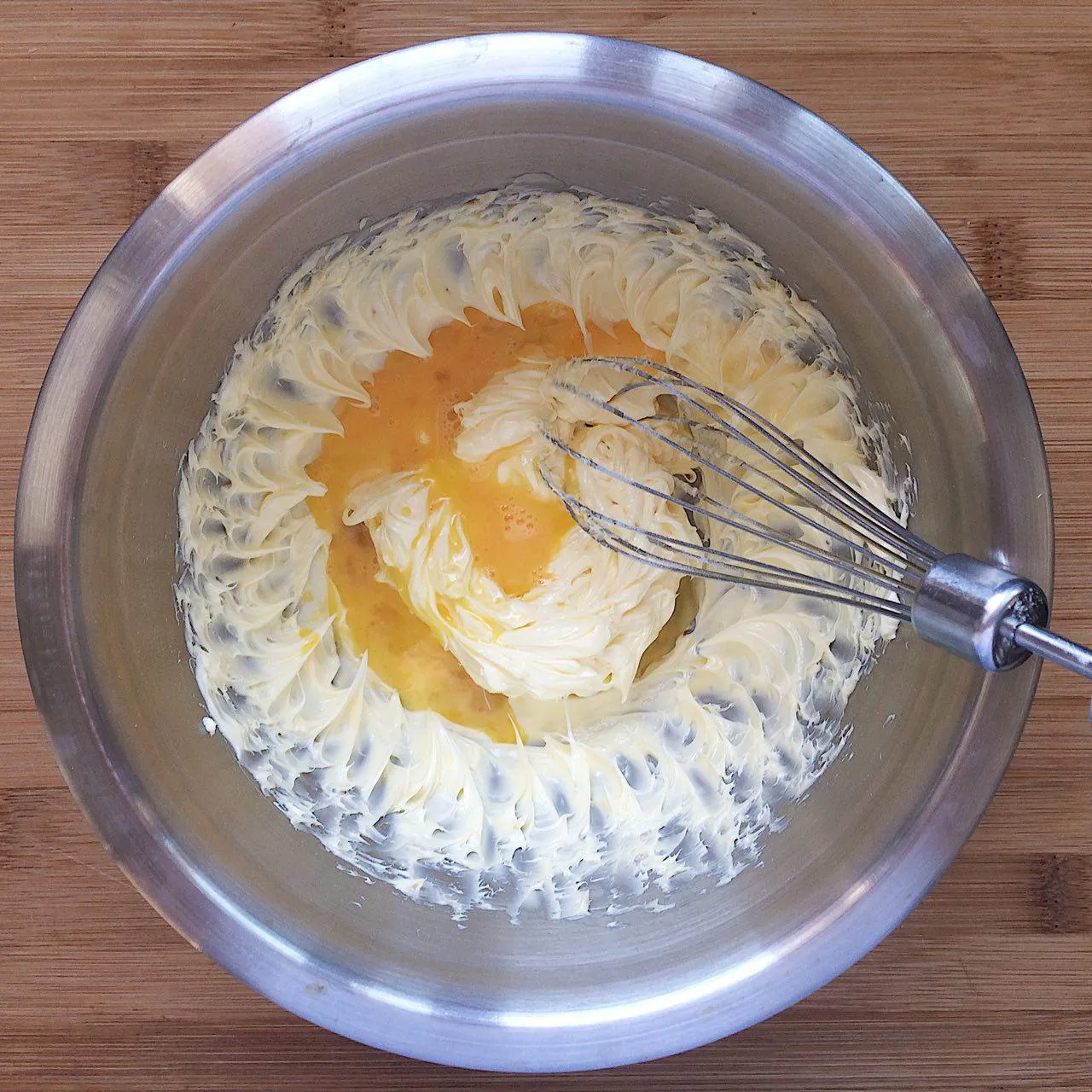 Добавляем яйцо (1 шт, 55 гр.), которое достали из холодильника вместе с маслом, щепотку соли, и снова взбиваем до однородности. Если на этом этапе добавишь холодное яйцо, то смесь может пойти комками. Это не страшно, но в следующий раз используй теплое.