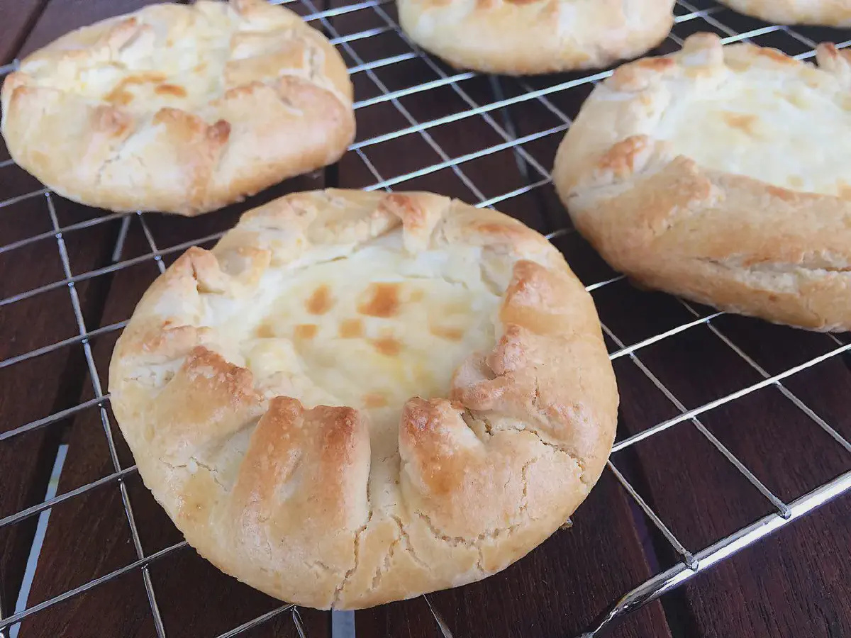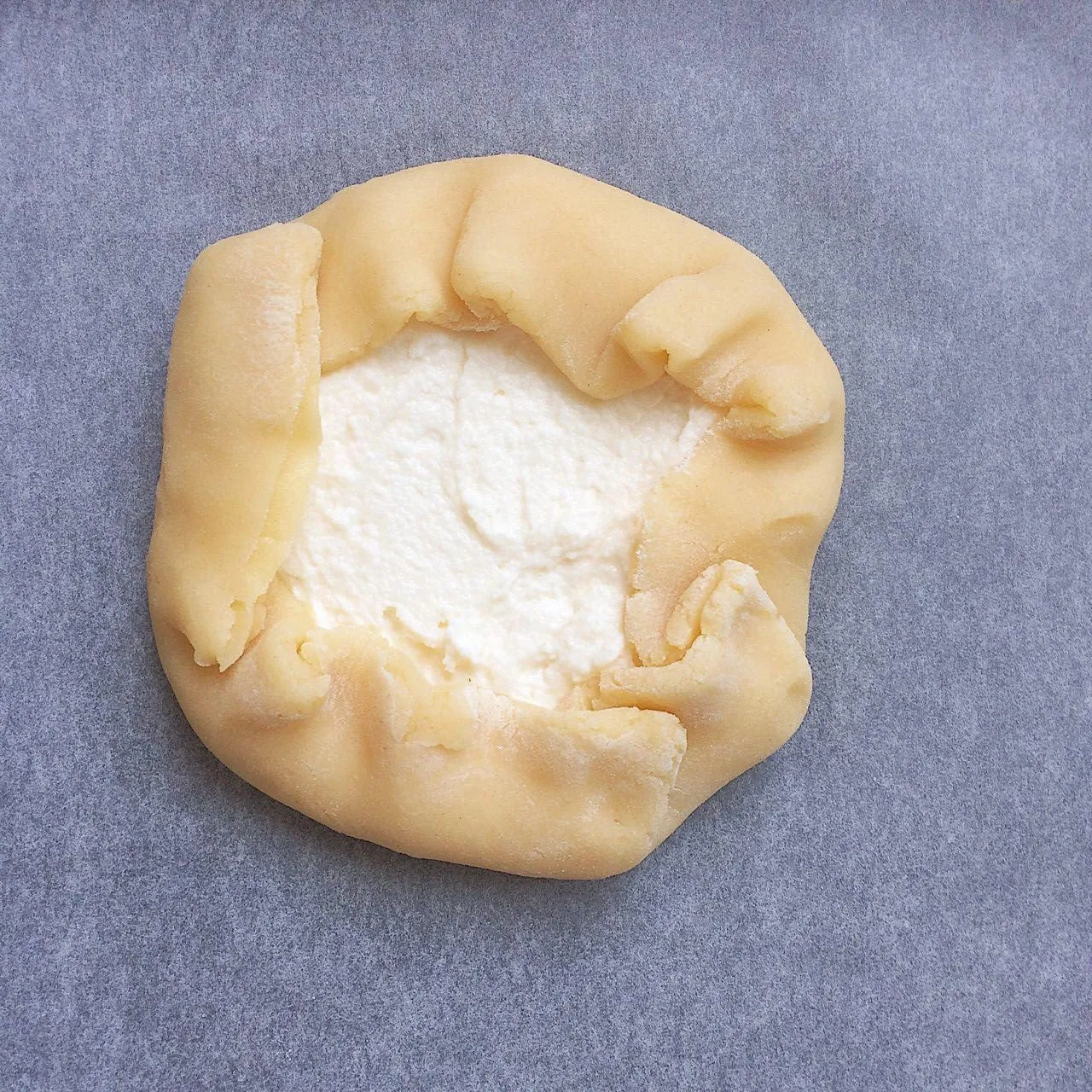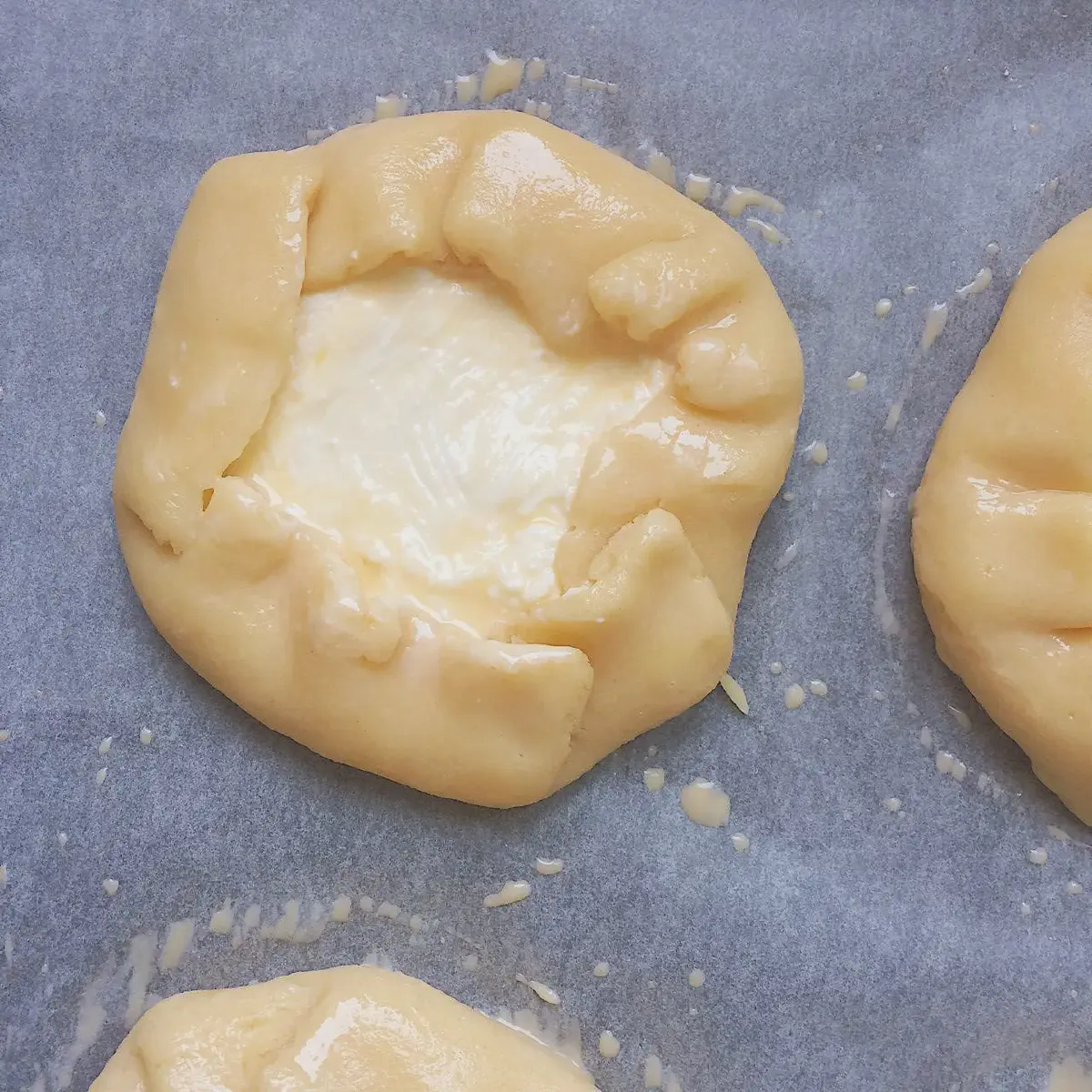 Разводим оставшийся от начинки желток (1/2 шт., 10 гр) с 1 ст.л. воды комнатной температуры, и смазываем смесью верхушку сочня (творог тоже, не только тесто). Здесь нужно как можно больше смазки подцеплять на кисточку — тогда творог не будет к ней сильно липнуть.