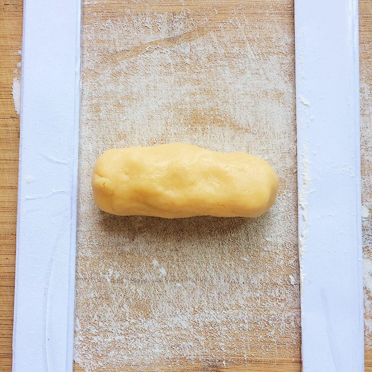 Ставим духовку греться до 200°С. Делим тесто на 6 частей, по ∼68 гр. По отдельности раскатываем каждую часть в колбаску, затем — колбаску в лепешку, между плашечками.