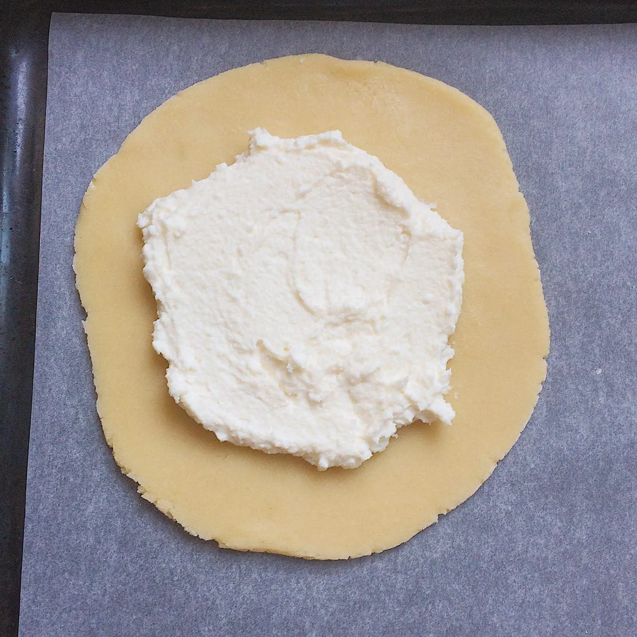Выкладываем сразу же на противень, застеленный бумагой для выпечки. Выкладываем начинку ∼50 гр. в центр лепешки. Собираем края — слегка внахлест, но центр остается открытым. Собирать сочень на столе, а потом переносить — не удобно — он мягкий, и может деформироваться, раскрыться, потечь и т.д. в момент переноса. Поэтому удобнее сразу на противне.