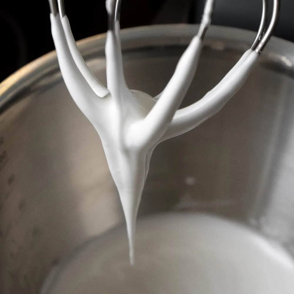 Потом — так же в 3-4 приема вводим сахарную пудру (40 гр.), и взбиваем до уверенного птичьего клюва. У меня на это уходит минут 5-10, зависит от скорости миксера.