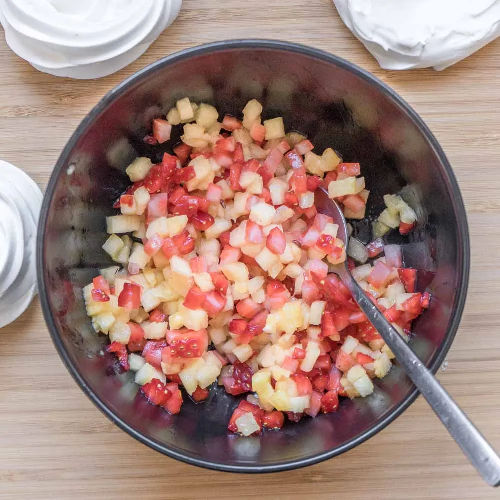 Для начинки режем мелким кубиком (3-5мм) клубнику и ананас. Можно брать любые другие ягоды/фрукты. Можно стабилизировать начинку желатином, и тогда она не будет размягчать основание так сильно. Я брала свежие фрукты, но через 2-3 часа дно протекло от сока.