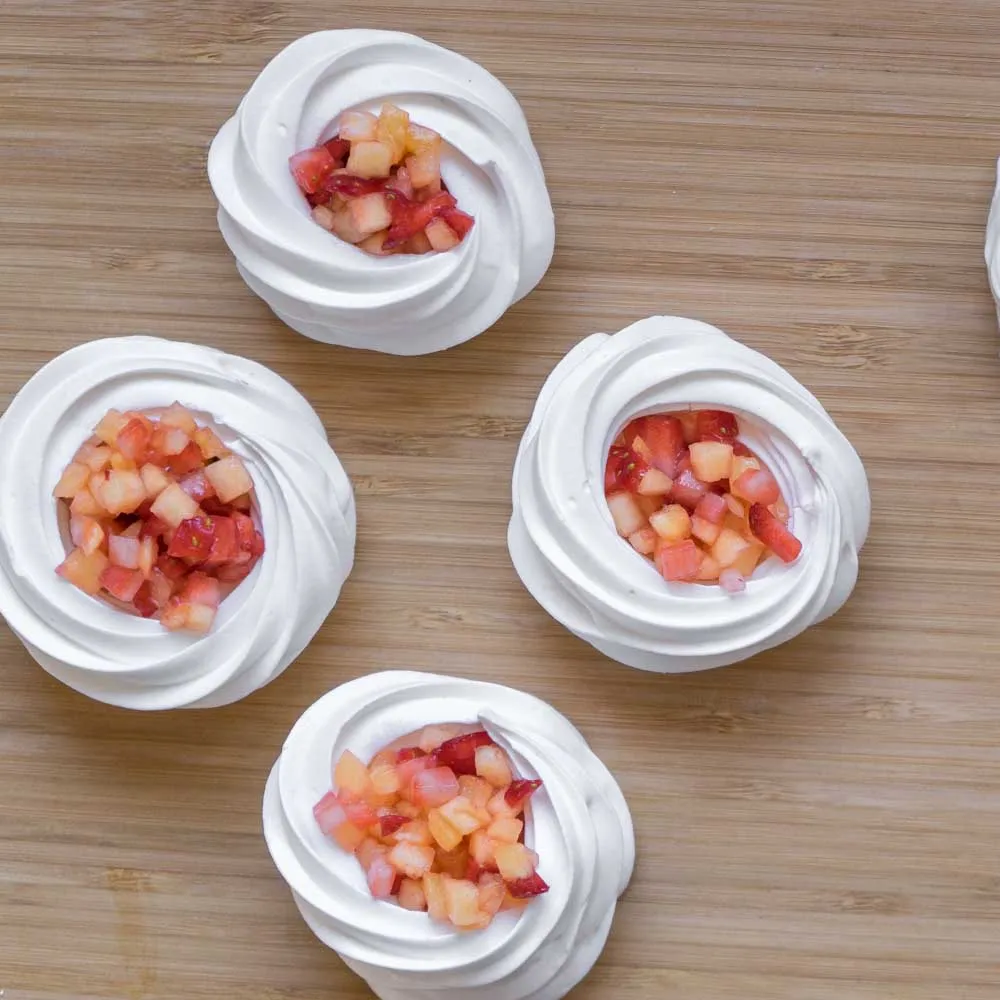 В готовую меренгу вмешиваем лопаточкой крахмал (3 гр). Выкладываем в кондитерский мешок и выдавливаем в виде гнездышек (дно + бортики) на противень с бумагой для выпечки. Можно выкладывать ложкой, а потом в центре делать небольшое углубление для начинки.