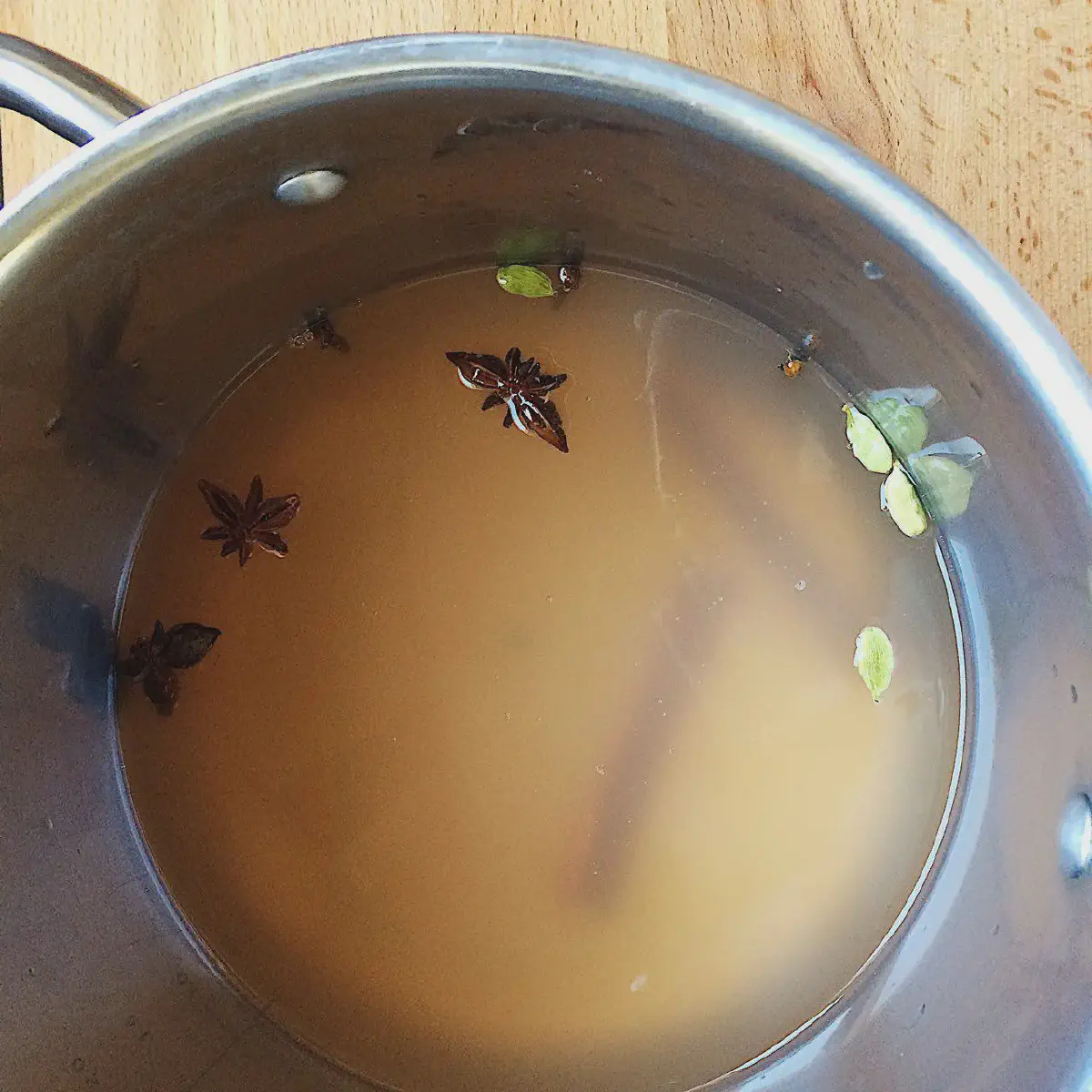 Добавляем пряности, и доводим почти до кипения на медленном-медленном огне — минут 15-20-30, зависит от начальной температуры жидкости.