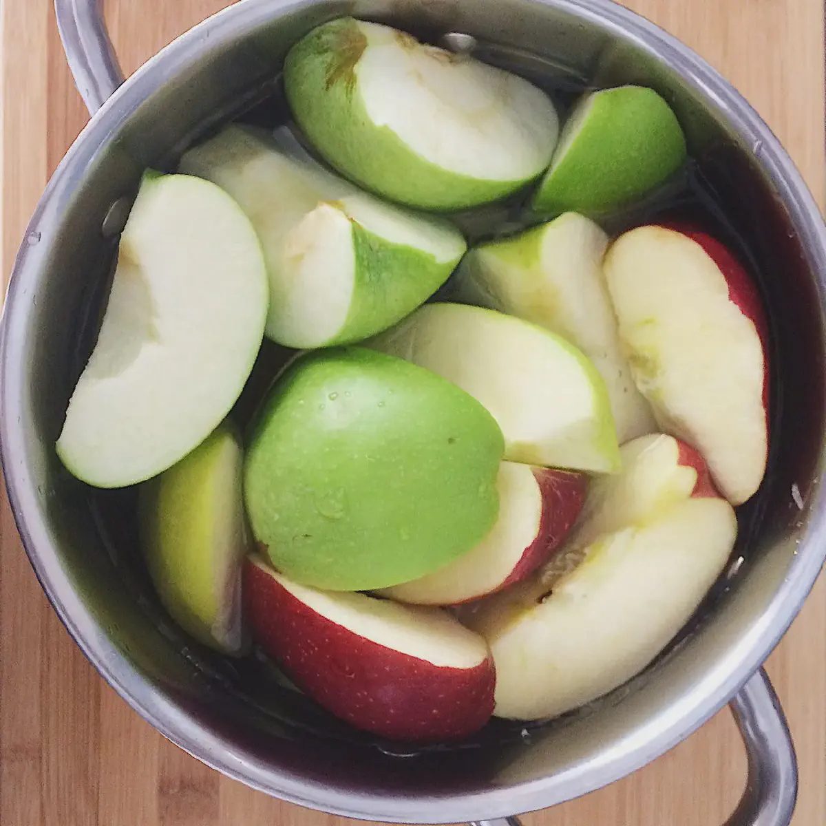Яблоки помыть, убрать хвостики, и порезать на четвертинки. Доставать семечки не нужно (в конце их процедим). Залить водой — она не будет полностью покрывать яблоки — так и должно быть. Кастрюльку выбирайте повместительнее — минимум на 3 литра для этих пропорций.