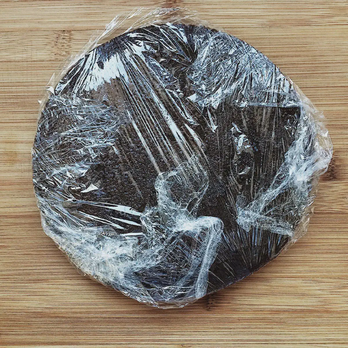 Для этого натягиваем пищевую пленку на форму — чтобы поверхность была гладкой, и без складок. Если нужно — протрите внешний край формы влажными пальцами, чтобы пленка к нему прилипала. Профи подогревают край горелкой, но не на всех кухнях она есть…