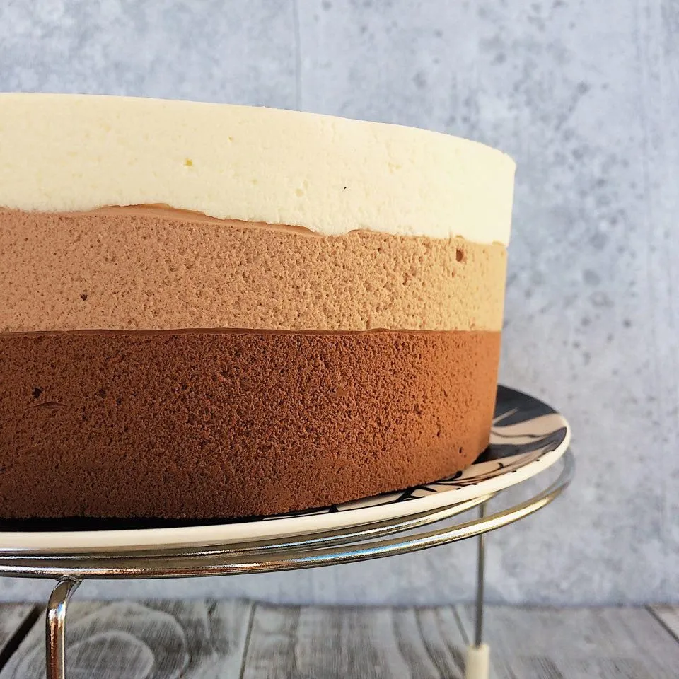 Легкий и гармоничный торт) Три слоя мусса и насыщенный шоколадный бисквит. Делается очень просто, главное — соблюдать пропорции и еще пару нюансов в приготовлении муссов.