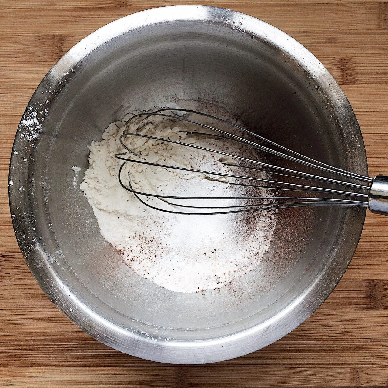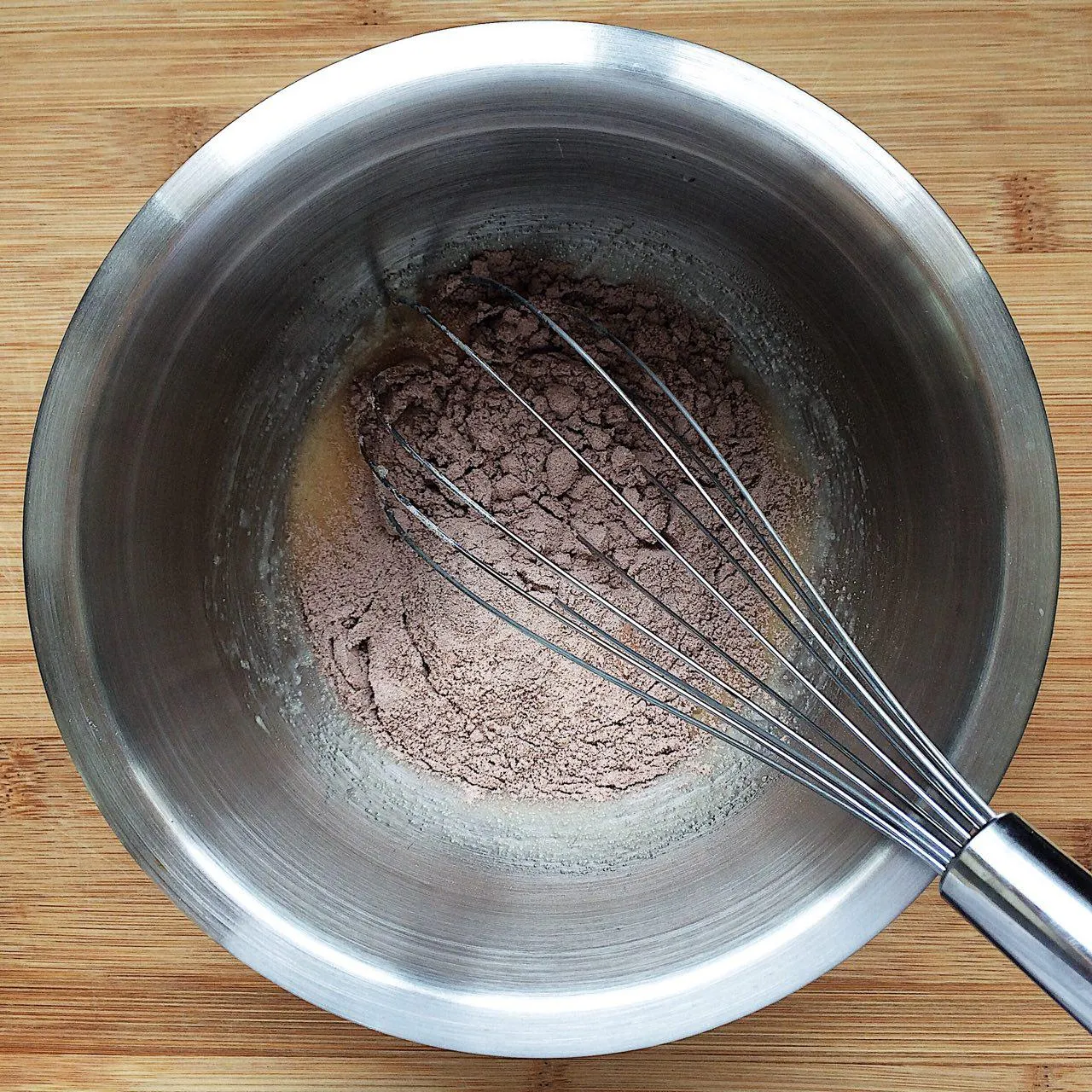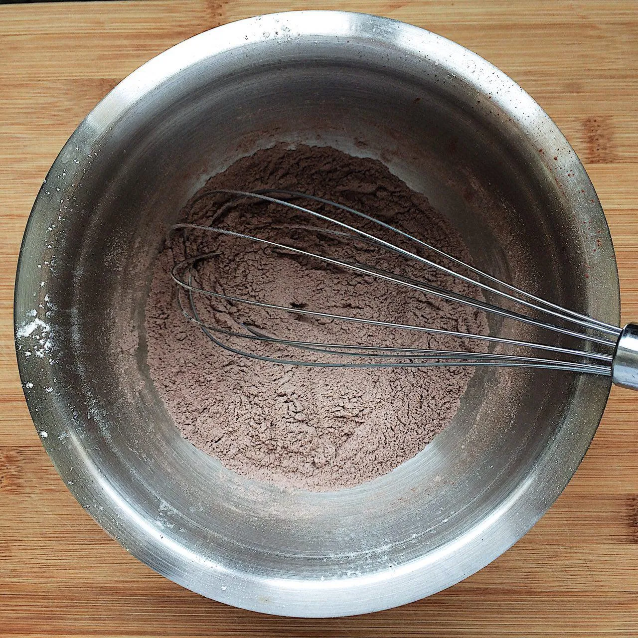 Просеять в миску муку (62 гр), какао (15 гр), разрыхлитель (1/3 ч.л. ∼1,3 гр), соду (1/3 ч.л. ∼1,3 гр.). Не опускайте соду — она нужна для правильной реакции, без нее корж может не подняться, будет плотным и казаться суховатым. Какао, соду и разрыхлитель тоже лучше просеять — так там точно не будет комочков, и неоднородностей в тесте. Хорошенько смешайте смесь венчиком.