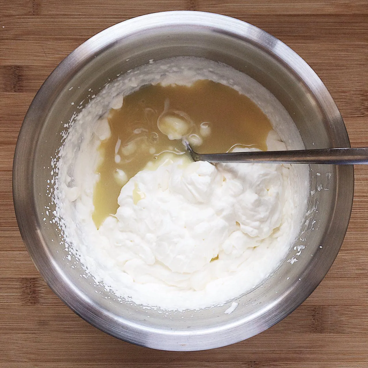 Аккуратно смешиваем со взбитыми сливками. Должна получиться однородная масса.