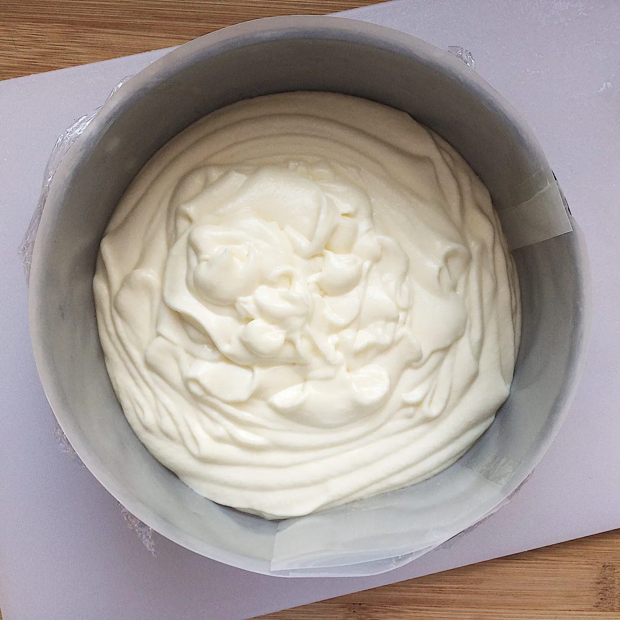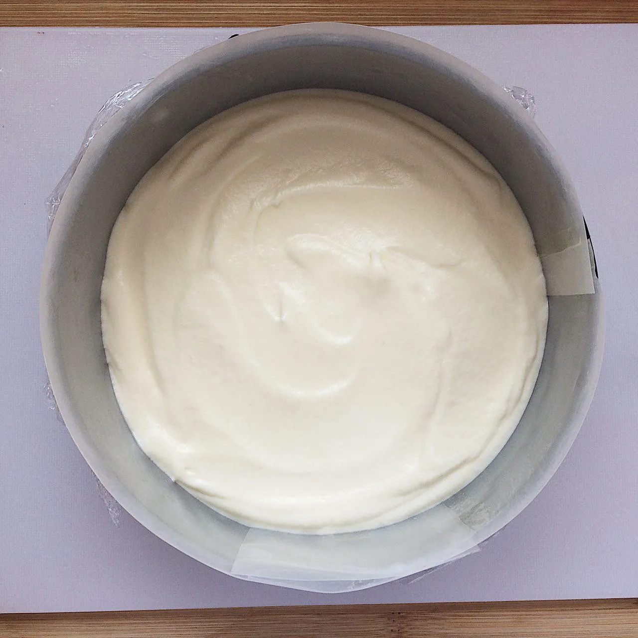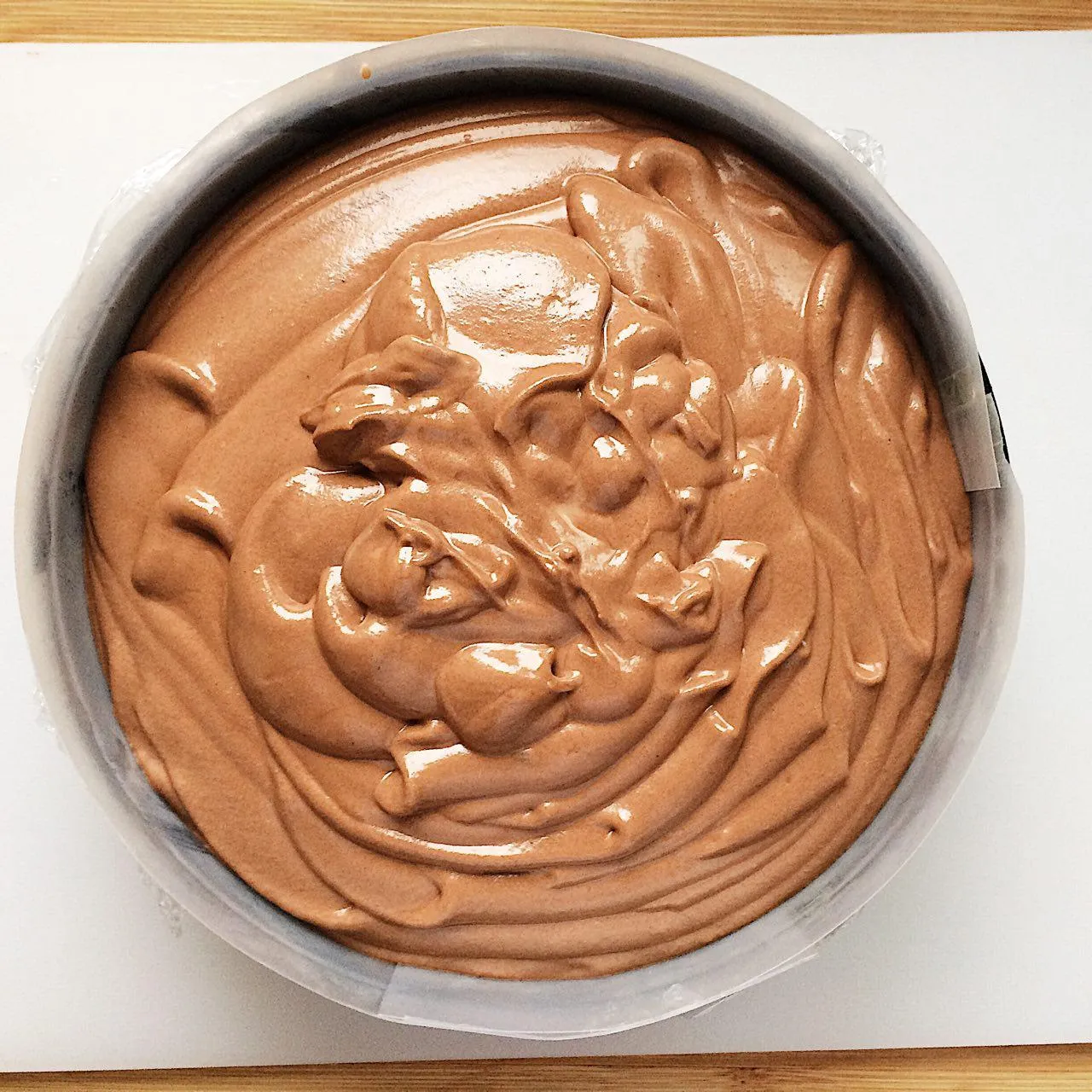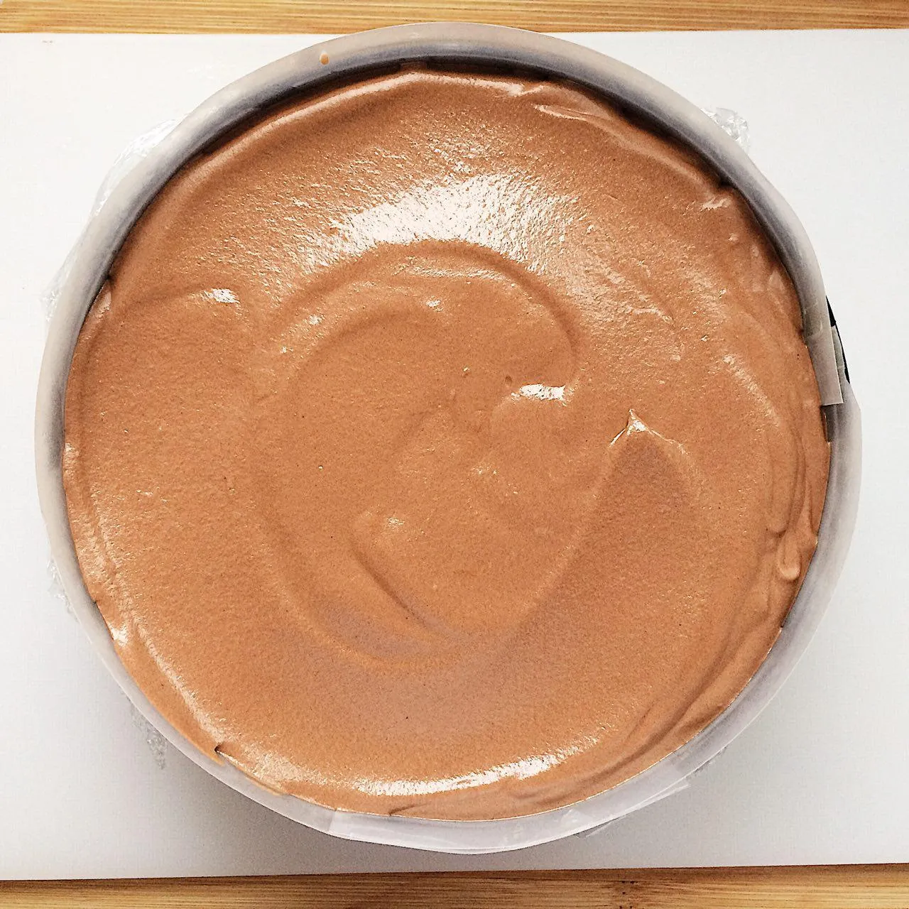 Ставим форму на доску (на ней она будет стоять до конца охлаждения, и полной стабилизации желатина). Наполняем первым слоем мусса. Выравниваем поверхность. Отправляем в холодильник, пока готовим следующий слой.
