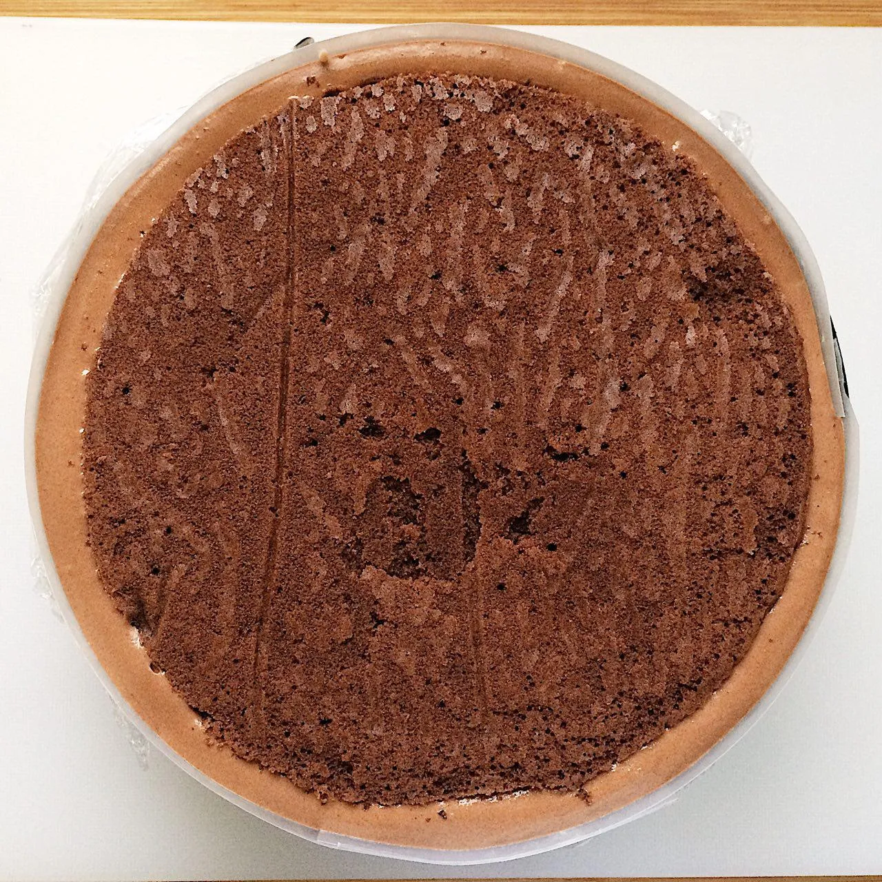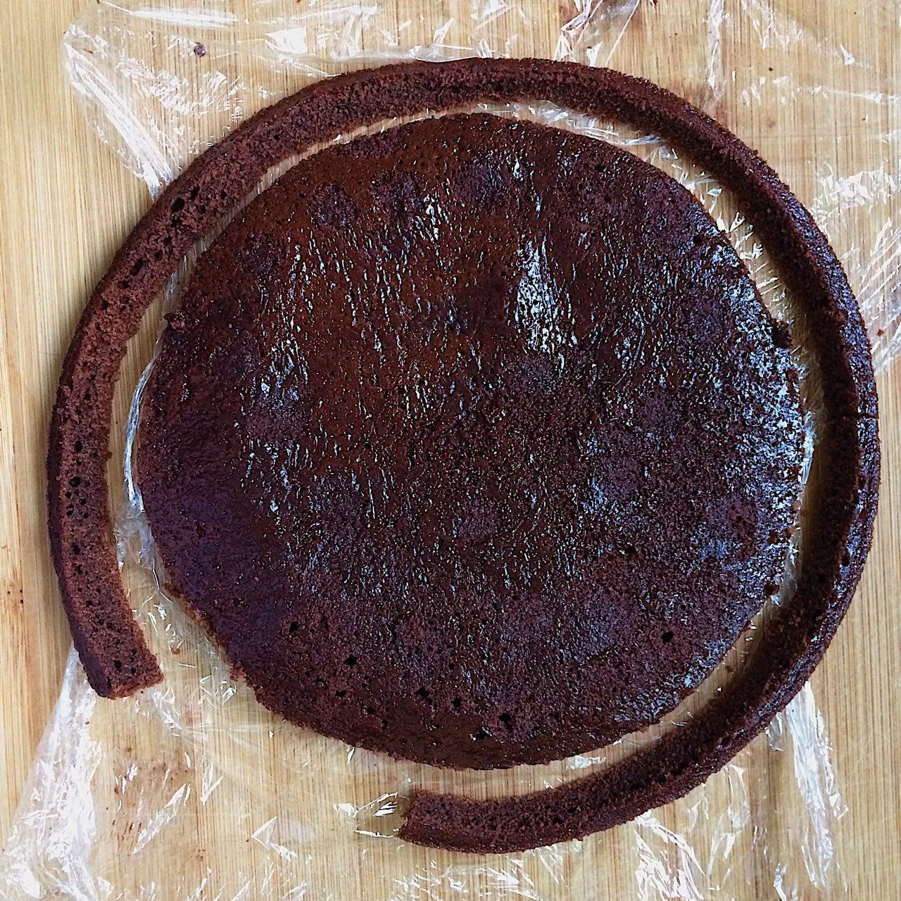 Достаем из формы, отлепляем все пленочки, переворачиваем и радуемся красавцу. Нижний слой выглядит чуть толще за счет утопленного в нем бисквита.