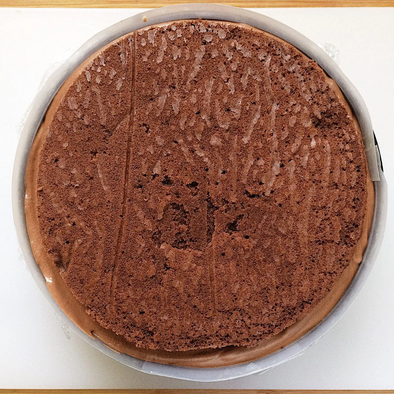 Чуть-чуть вращая, утапливаем корж в муссе.