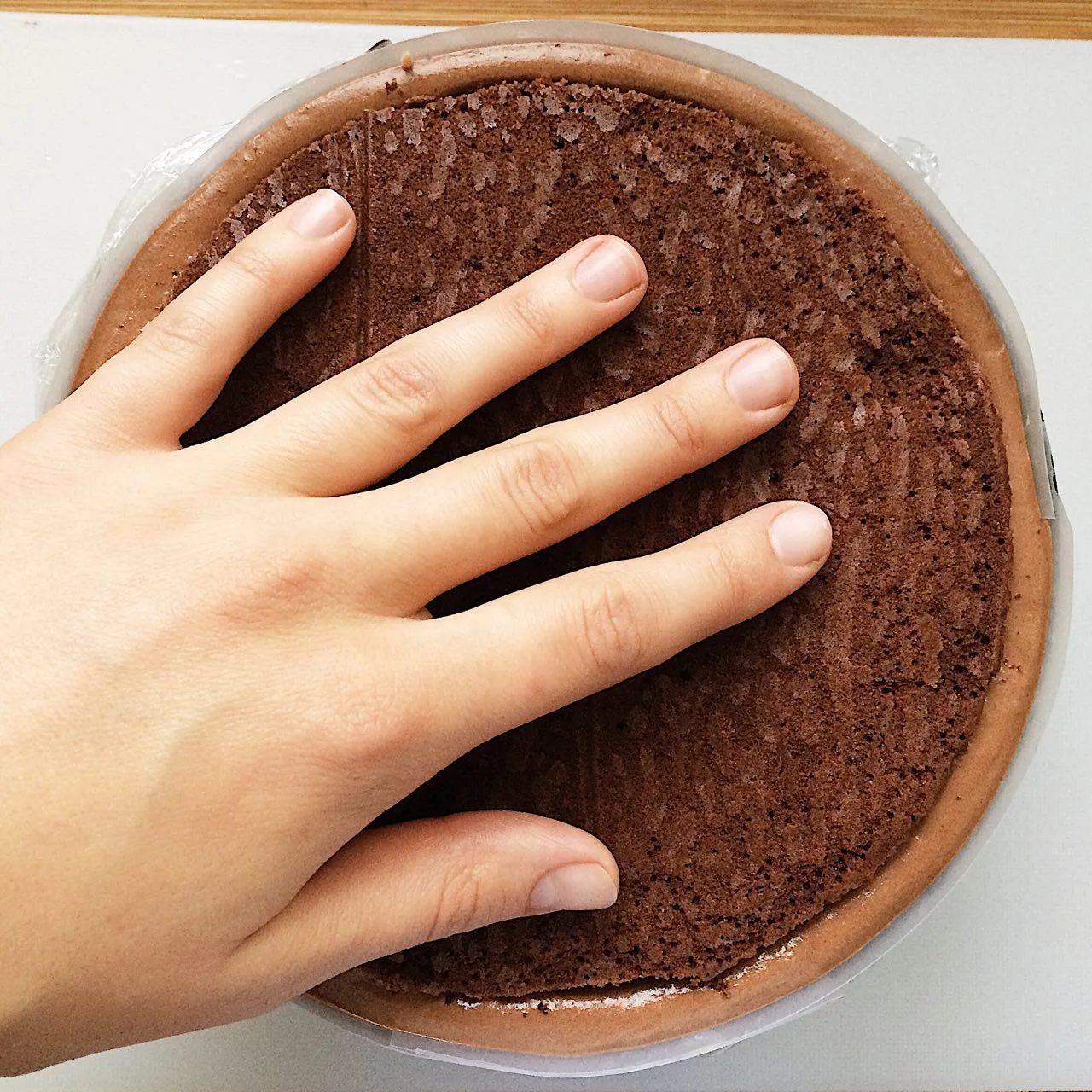 Для этого натягиваем пищевую пленку на форму — чтобы поверхность была гладкой, и без складок. Если нужно — протрите внешний край формы влажными пальцами, чтобы пленка к нему прилипала. Профи подогревают край горелкой, но не на всех кухнях она есть…